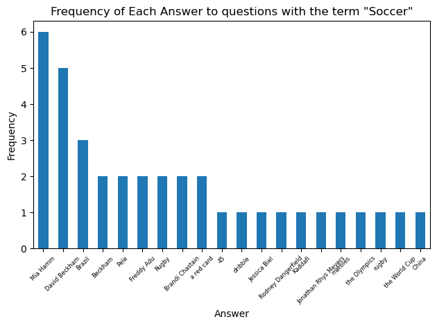 The value_counts() method provides a perfect solution here. We can just define our ‘counts’ of unique answers to a filtered question bank as the value_counts() of the Answer column. I wrote two seperate functions that utilize the counts item. One of them simply prints a frequency count of each unique answer, the other one plots the frequency of answers as a bar chart (restricted to the 20 most frequent to keep the chart tidy)